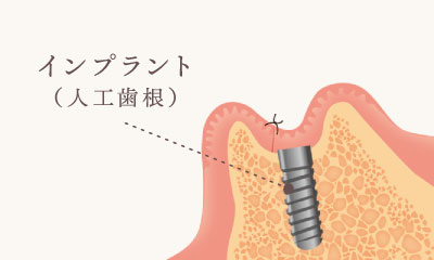 顎の骨に人工歯根(インプラント)を埋め込み、その上に土台(アバットメント)と人工歯(上部構造)を取り付ける治療法です。